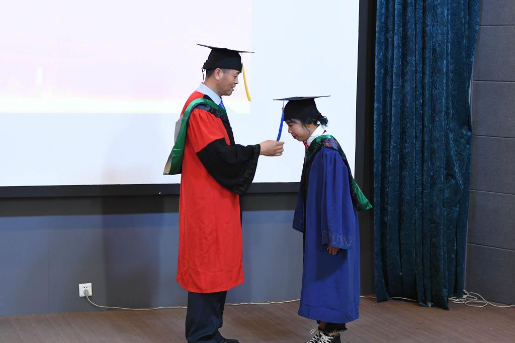 学位授予仪式在雄壮的国歌声中拉开了帷幕。学院副院长、学位分委会主席张明军教授宣读了九游体育官网2020届毕业研究生授予学位名单。副院长、学位分委会副主席孙博兴教授、副主席逄大欣教授、委员任文陟教授作为主礼教授为毕业研究生拨穗正冠,院长张嘉保教授颁发学位证书。