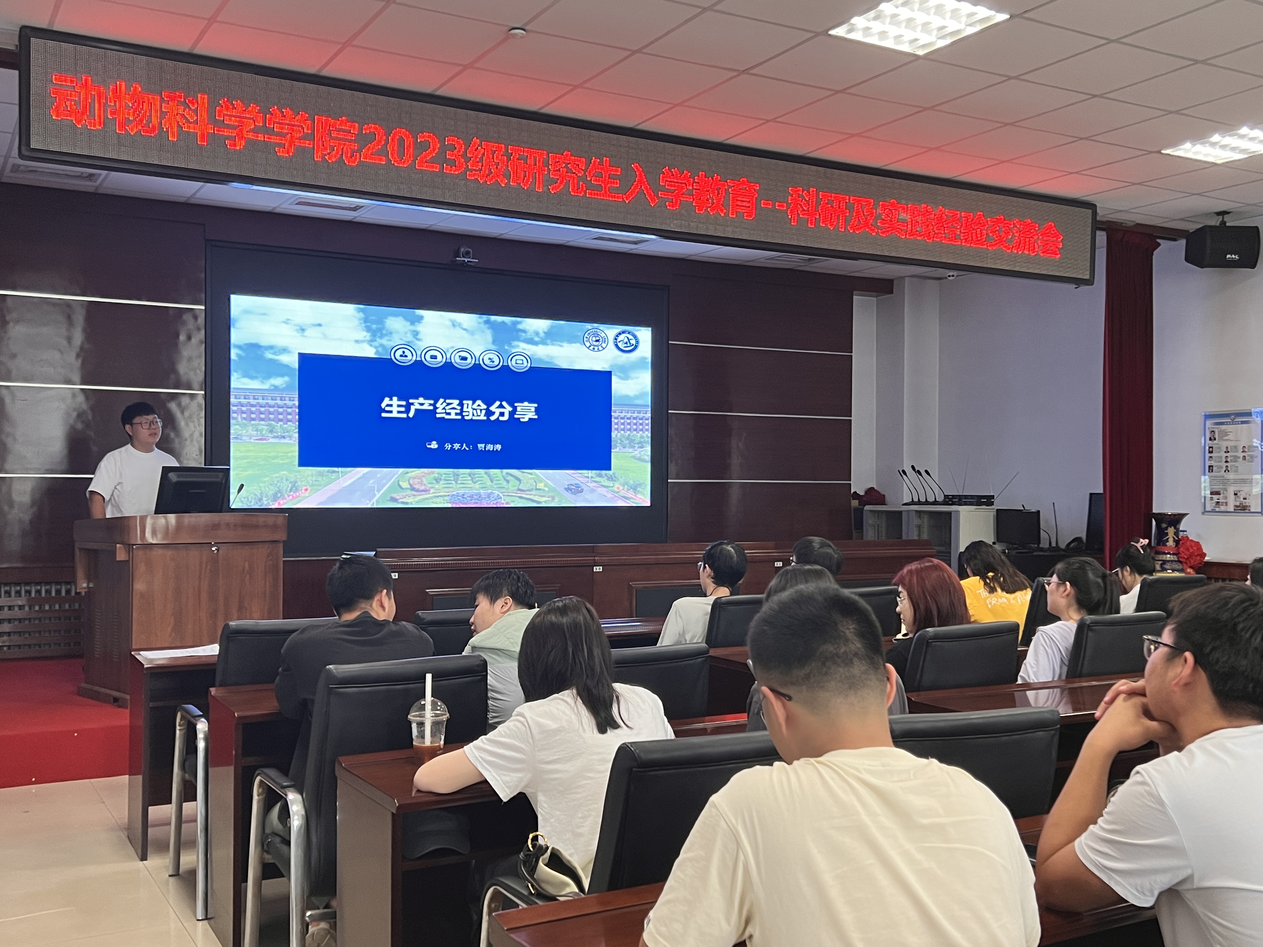随后,贾海涛硕士从生产实践的角度出发,阐述产学研一体在研究生培养过程中的重要意义。他首先介绍了生产实践和科研的关系,表示研究生应当在实践中发现问题,通过研究解决问题,将论文写在大地上。同时结合产业和行业对复合型人才的需求,阐述研究生应当增强对基础学科知识的学习,主动参与到生产实践过程中,掌握前沿的生产技术,积极应对未来的挑战。最后,贾海涛建议大家身为新农科人,及时关注行业的发展近况,了解企业动向,为就业打下坚实的基础。