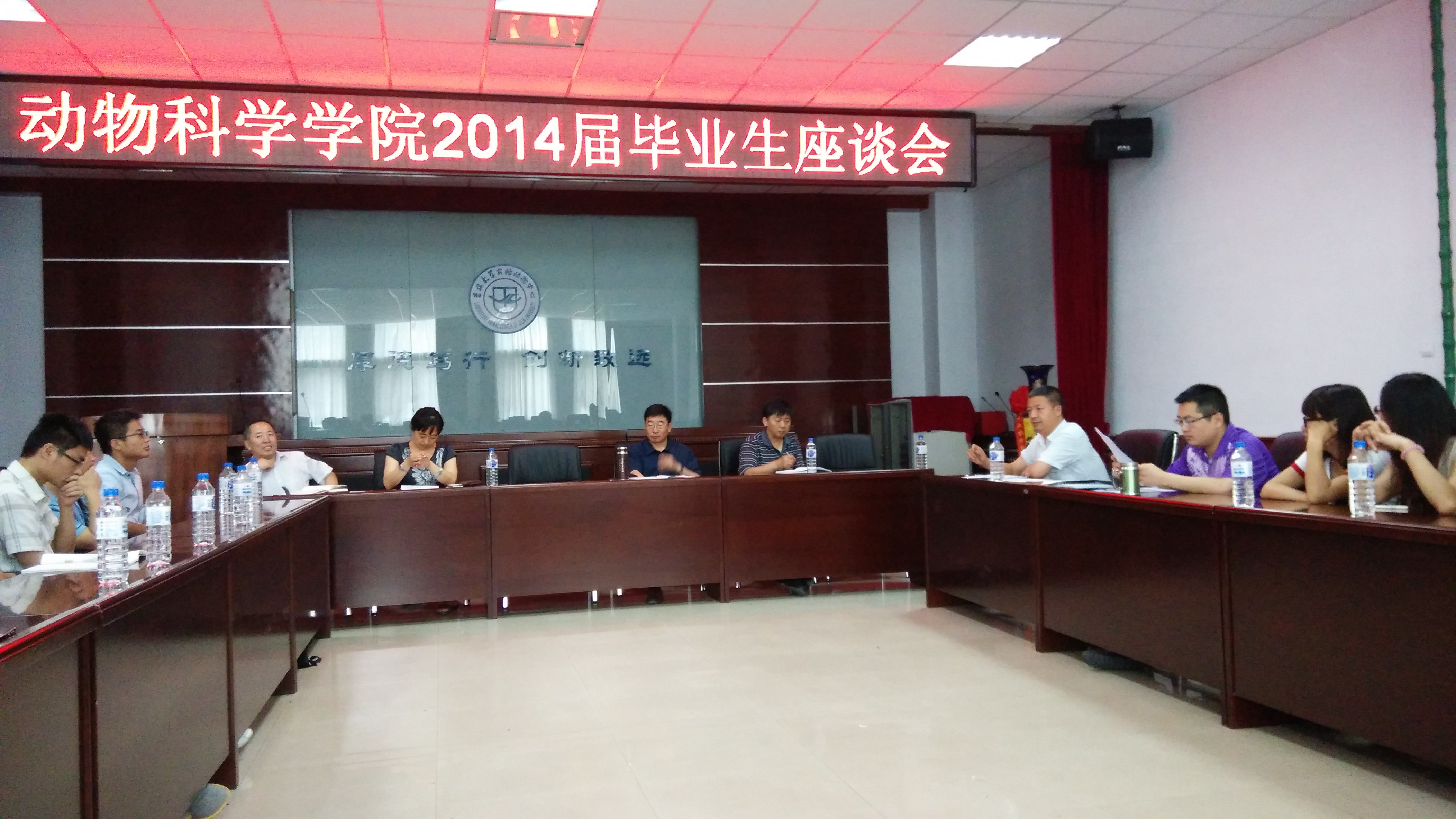 2014年6月23日下午2:00,九游体育官网2014届毕业生座谈会在学院一楼会议室举行,此次座谈会以“心系动科,共谋学院长足发展”为主题,由学院党委副书记曹伟光主持,院长张嘉保教授,副院长任文陟教授,副院长于景海老师,生物技术系主任逄大欣教授,动物科学系主任沈景林教授,实验动物系党支部书记袁宝老师,各办公室主任、毕业班辅导员及14名优秀毕业生代表均到场参加。
