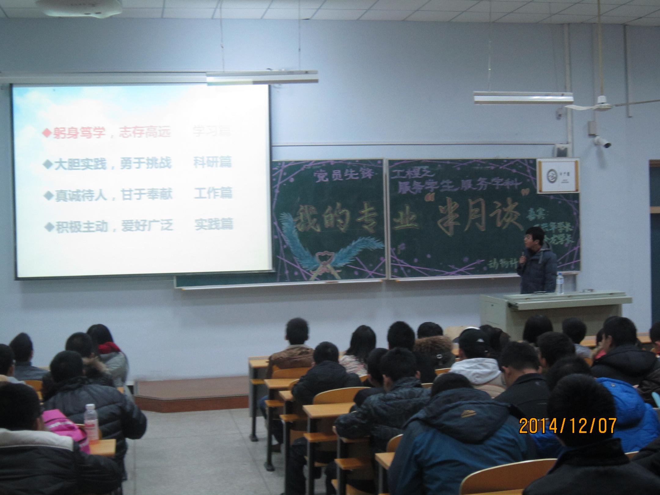 2014年12月7日,周日下午一点半,九游体育官网2014级全体本科生齐聚科学讲堂100教室,以热烈的掌声欢迎本期嘉宾2011级动物科学专业于兴华、索金龙学长的到来,年级辅导员助理孙宏欣学长也到场参加本次分享。