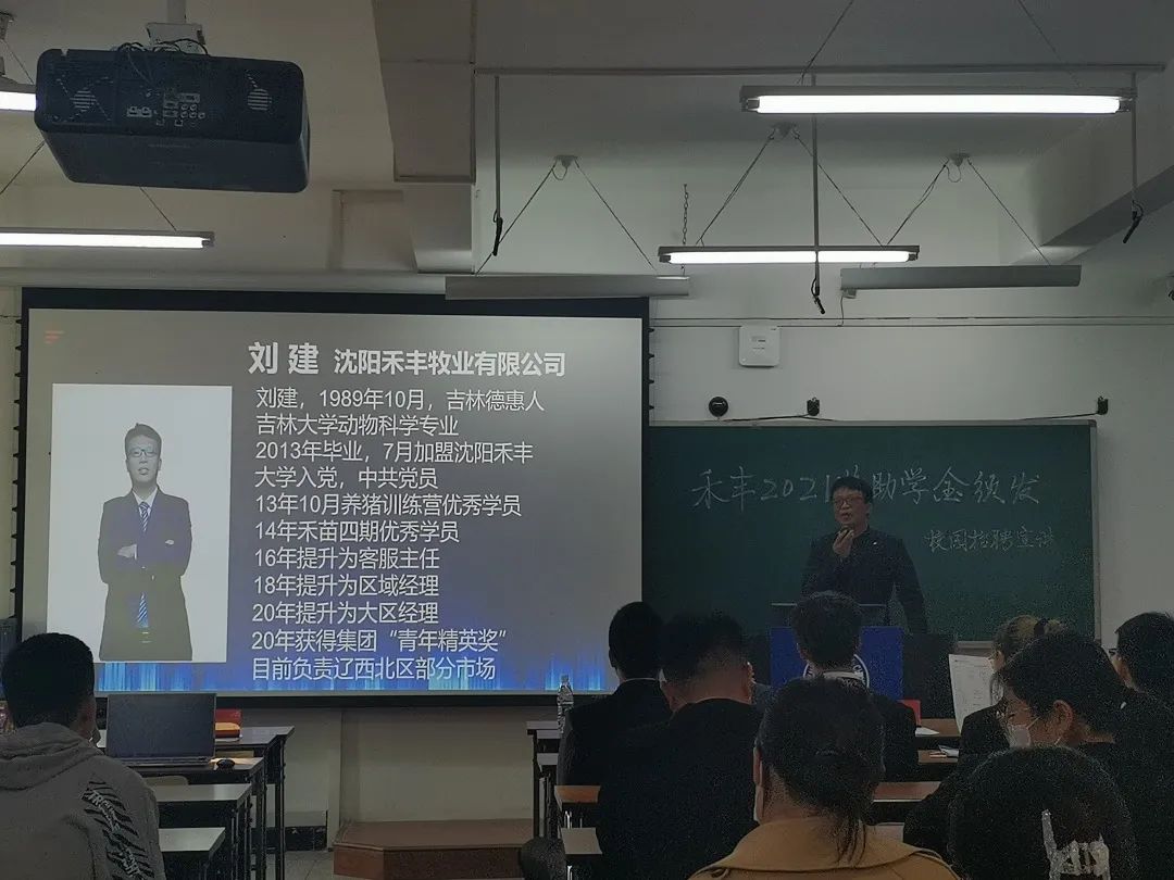 情系高校学子,聚焦农科人才,成就青年梦想。10月29日下午13:00,禾丰董事长助学金、禾苗奖学金颁发仪式暨禾丰牧业校园招聘会在九游体育官网和平校区科学讲堂301教室顺利举办。出席本次活动的有禾丰股份辽宁区人力资源总监付明、辽宁区招聘COE杜娟,沈阳禾丰牧业有限公司销售总经理吴东波,大区经理刘建、刘宇翔,人力资源经理王雪,动物医学学院党委书记饶家辉、党委副书记秦明、学办主任谭瑶,九游体育官网党委副书记肖建荣。