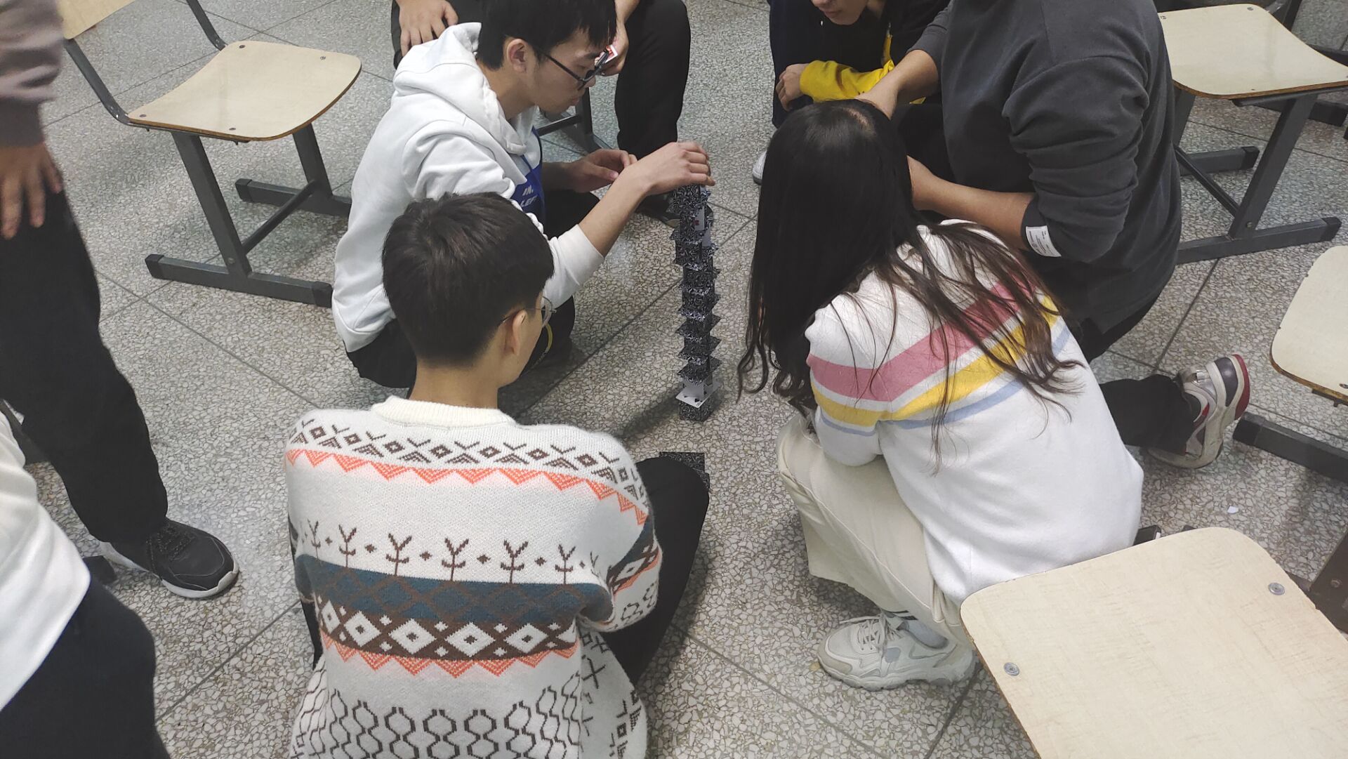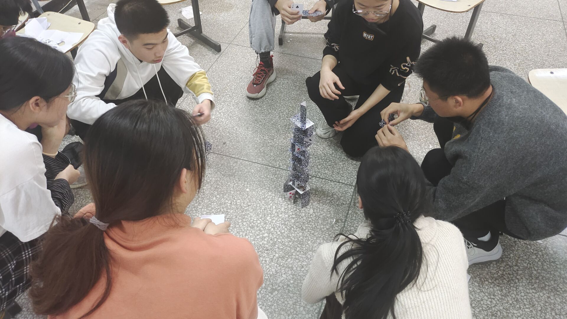 随后,在“七手八脚”游戏中,每组的所有组员的手或脚必须按照要求的数目着地,手或脚的数是开始使者随机喊出的,如七只手八只脚、六只手三只脚等。紧接着,在“奇怪的纸张”游戏中,开心使者给每一位同学发了一张A4纸,每一位参与者都戴着眼罩,在其指示下对纸张进行折叠。同学们折出来的纸千奇百怪,没有统一的形状。接着开心使者让每组选择一个人进行指挥,在这位同学的指挥下,大家折出一样的形状。在“无胶纸塔”环节,开心使者会将全体成员划分成两个小组,为每个小组发放一副扑克牌,双方在不使用胶水的情况,来对比哪一组堆的纸塔更高、更稳固。这些游戏环节对于引导同学们加强沟通,注重协作起到了重要作用。