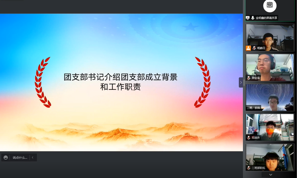 疫情严重,为了应对严峻的疫情防控形势,学校实行封闭管理,为国家抗击疫情贡献青春力量。根据《关于疫情防控期间成立团支部的通知》,切实发挥共青团组织在防疫控疫工作中的战斗堡垒作用及团员的先锋模范作用,突出特殊时期团支部的组织凝聚力,九游体育官网依托于南苑六公寓所有男生团员成立九游体育官网第一临时团支部。2022年3月27日星期日晚七点,九游体育官网第一临时团支部成立大会在线上召开。