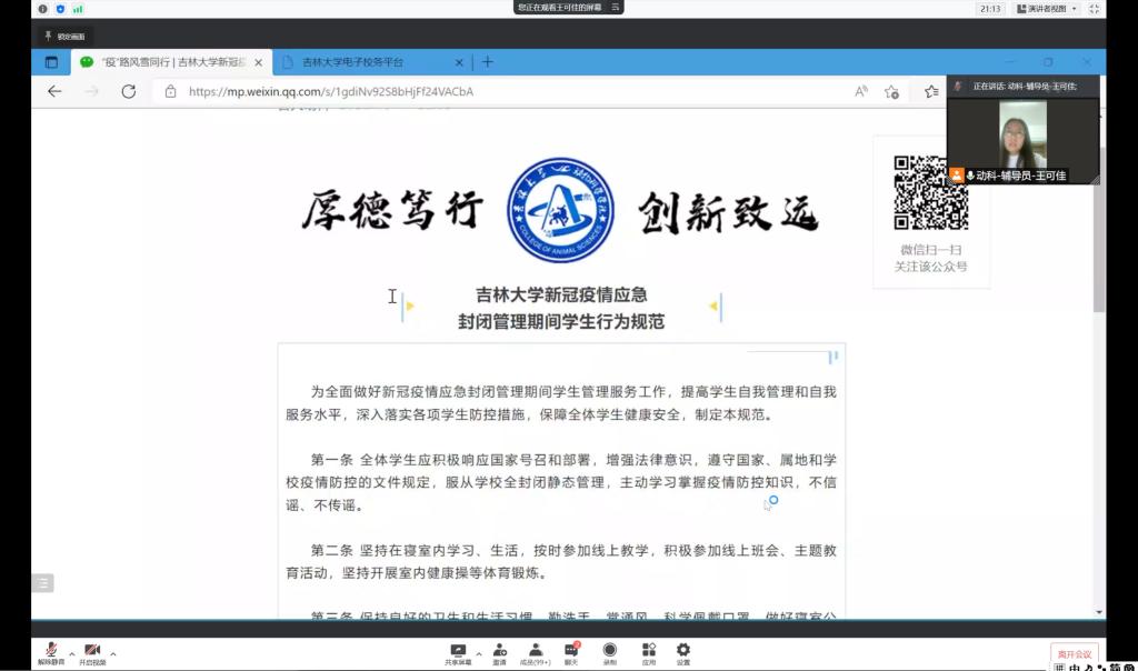为全面做好新冠疫情应急封闭管理期间学生管理服务工作,深入落实各项学生防控措施,保障全体学生健康安全,4月5日晚,九游体育官网2021级本科生组织召开了以“守望相助,共克时艰”为主题的年级大会。会议由辅导员王可佳主持。