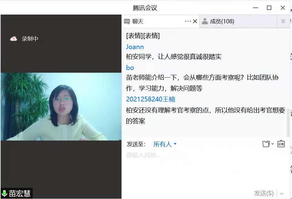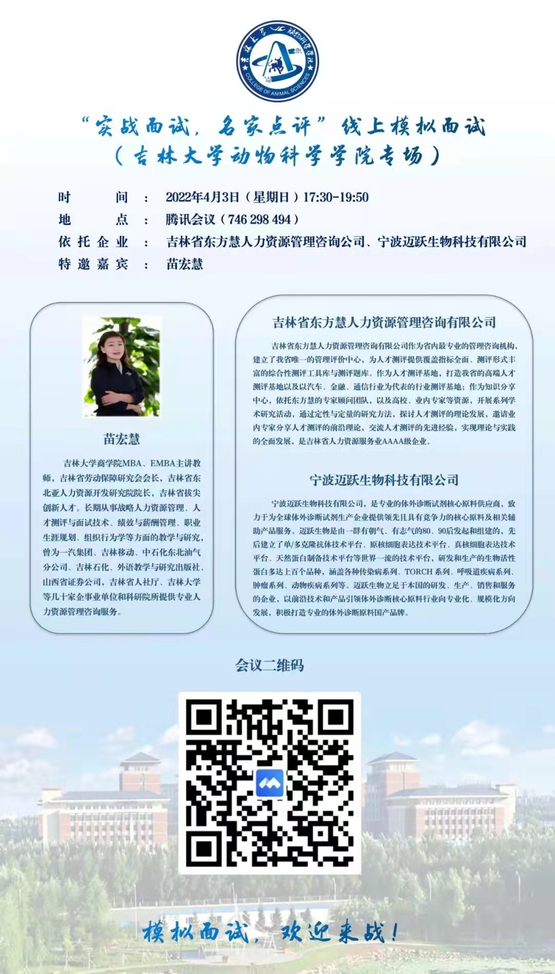 4月3日,学院开展“实战面试 名家点评”线上模拟面试会,邀请九游体育官网商学与管理学院人力资源管理专家苗宏慧老师,宁波迈跃生物科技有限公司总经理、优秀校友牛伟萍女士在线指导,学院180余名师生参会。