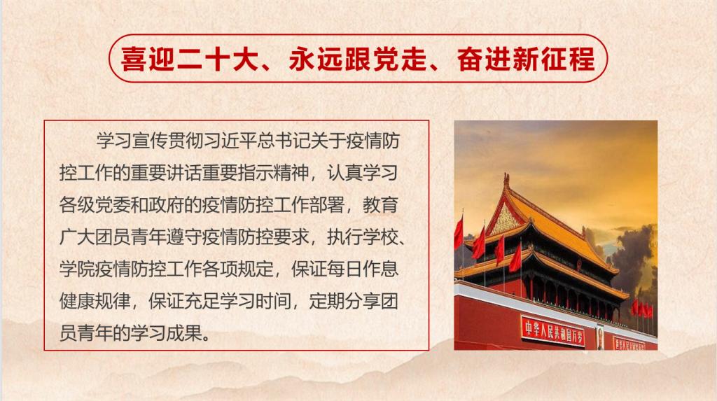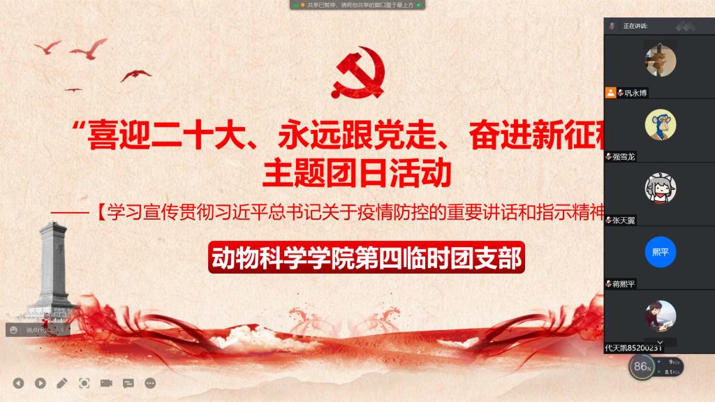 为进一步落实学习宣传贯彻习近平总书记关于疫情防控工作的重要讲话重要指示精神,认真学习各级党委和政府的疫情防控工作部署,教育广大团员青年遵守疫情防控要求,执行学校、学院疫情防控工作各项规定,九游体育官网第四临时团支部于2022年4月3日下午19时,依托腾讯会议开展“喜迎二十大、永远跟党走、奋进新征程”主题团日活动。九游体育官网第四临时团支部全体同学积极参与。活动由团支书巩永博主持。