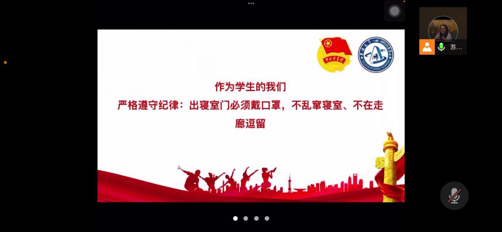 会议最后,苏廖枷域提醒同学们要严格遵守学校纪律,出寝室门必须戴口罩,不乱窜寝室、不在走廊逗留等。