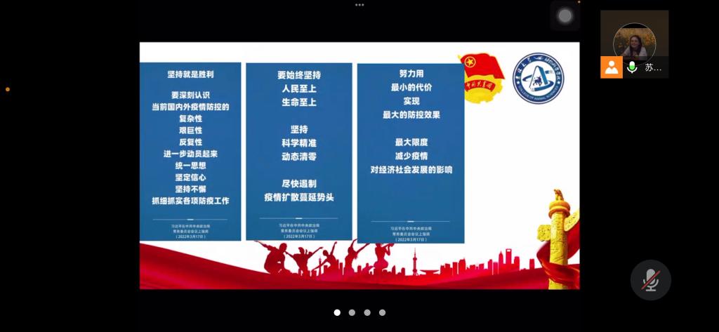 通过此次线上会议,同学们深入学习了习近平总书记提出的“外防输入、内防反弹”总策略和“动态清零”总方针,同时也让同学们感受到国家对于疫情防控的重视,提高大家的自我保护意识。持之以恒,方能慎终如始,在这场正在博弈的战“疫”中,我们终将取得胜利!