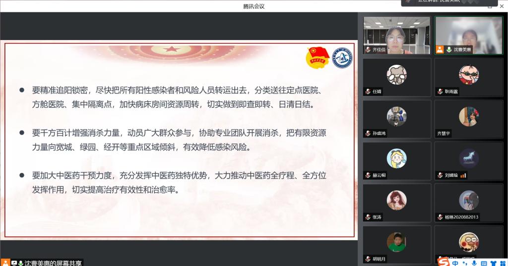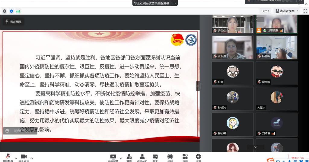 2022年初,一场突如其来的疫情打乱了原本的校园生活秩序。在全面封控的形势下,为坚定共青团员万众一心、共同抗“疫”的理想信念,培养爱党爱团的家国情怀,学习贯彻习近平总书记关于疫情防控工作的重要讲话精神,九游体育官网第十一临时团支部于4月8日晚20点开展“喜迎十二大,永远跟党走,奋进新征程”为主题团日活动。本次团课活动借助腾讯会议,以线上形式开展,会议由团支书沈曹美惠主持,支部全体成员参加。