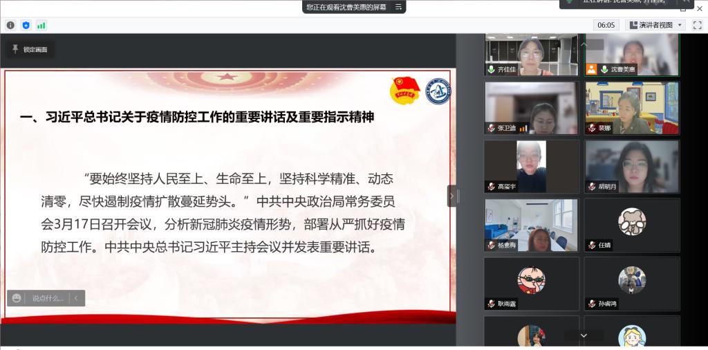 活动第一项,由沈曹美惠分享习近平总书记关于疫情防控工作的重要讲话及指示精神。她通过文字讲解、播放视频等方式,让全体团员对讲话内容有了更深刻的了解。会议期间大家踊跃交流学习的心得体会,形成了“学习领袖青春故事,争做知行合一青年”的浓厚氛围。