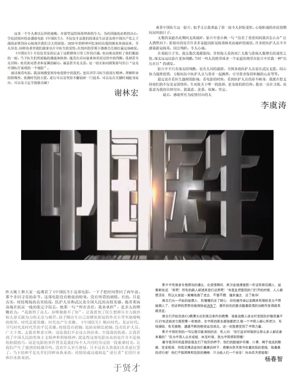于贤材同学接着说到,“晚上和大家一起观看了《中国医生》这部电影,一下子把时间带回了两年前。那个非同寻常的春节。这部电影没有酷炫的特效,没有所谓的剧情。有的,只是真实,疫情现场的真实情况,医护人员和武汉及全国人民的真情实感。拖着重病奋战在抗议一线的张定宇院长,他那一句“所有责任,我来承担”,是多么的铿锵有力,“我救得了众人,却唯独救不了你”,让我看到了医生想拼尽全力救治病人却无能为力的无奈与痛苦。孩子刚出生自己却感染新冠的外卖小哥坐地嚎啕的绝望。时代需要英雄,时代也产生英雄。《中国医生》顺应时代,见证时代,书写时代及时代里的平民英雄。疫情没有硝烟,危险却堪比硝烟,没有医护人员、广大干部、志愿者和老百姓,这仗我们不会这么快结束。空荡荡的街道,让我看到了中国人民的集体主义精神和利他精神。我觉得这部电影出众的也许并不是他的拍摄技巧,而是电影的事件背景是我们每个人共同经历过的一段艰难时光,让我们产生了强烈的情感共鸣。没有什么岁月静好,只不过有人替我们负重前行罢了,当下的和平是先辈们用鲜血换来的!疫情的成功遏制是”逆行者”们用汗水和泪水换来的!”