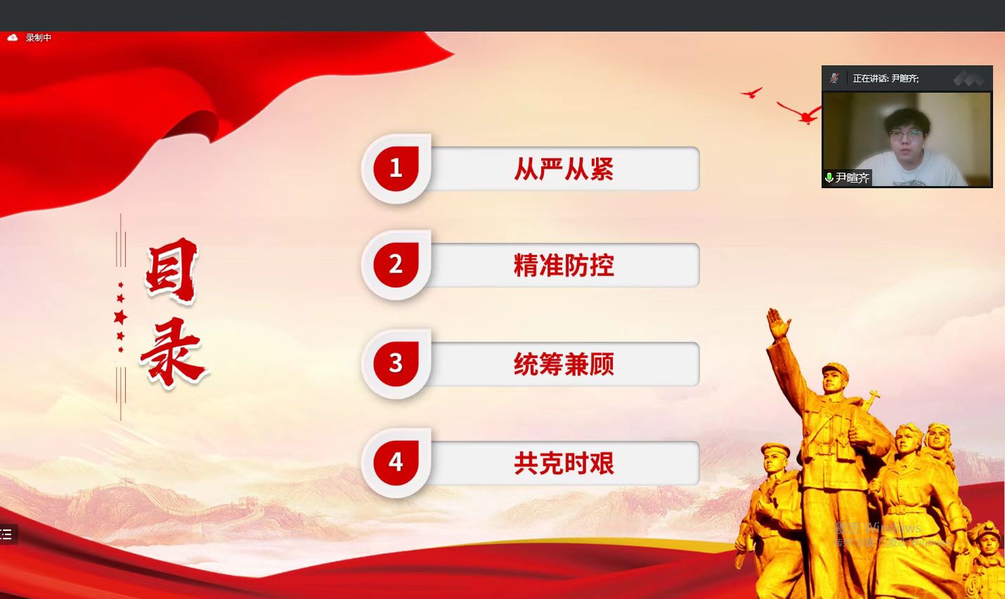 为深入学习贯彻习近平总书记关于“分析新冠肺炎疫情形势,部署从严抓好疫情防控工作”重要讲话精神,2022年4月30日晚7时,九游体育官网本科学生党支部于线上开展战“疫”时不我待,坚持就是胜利——学习习近平总书记关于从严抓好疫情防控工作重要讲话精神,本次会议由学生党员王文婧主持。学院党委副书记肖建荣、学生辅导员尹暄齐、王可佳以及支部全体学生党员参会。