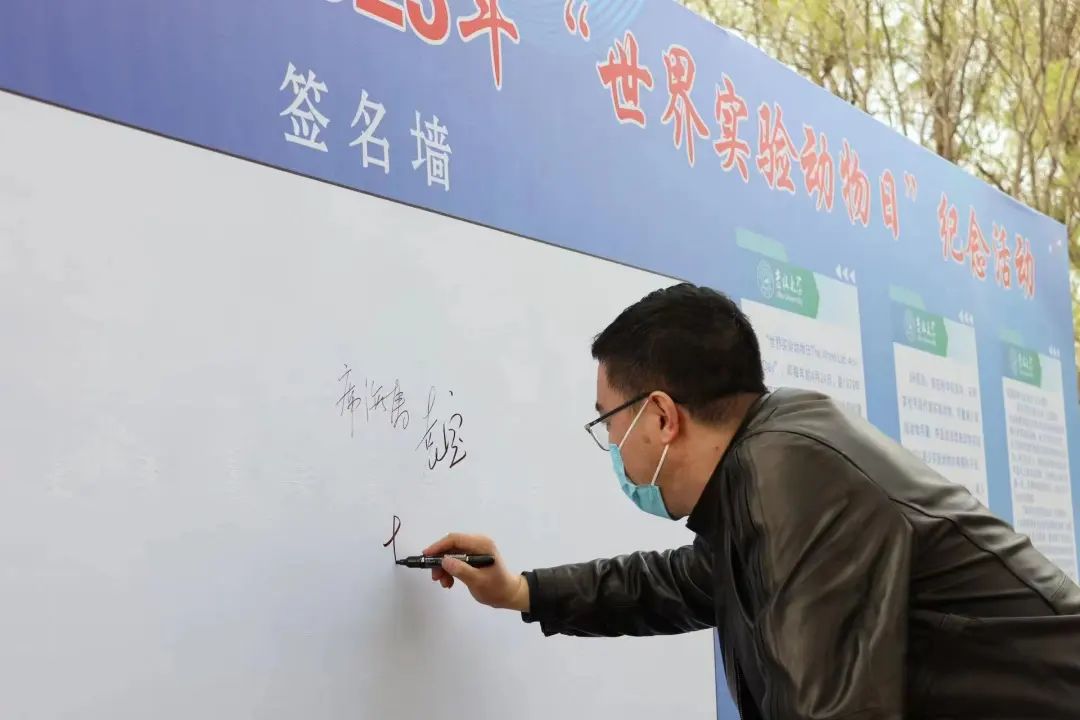 随后,席海涛处长代表实验室管理处向专程前来参加仪式的各位师生表示敬意。席处长高度评价了实验动物在疫情期间为我国新冠疫苗、药物研发过程中做出的巨大贡献,以及在学校封控时期,实验动物中心全体工作人员为保障我校实验动物生物安全做出的辛苦付出。他强调,九游体育官网每年实验动物使用量超10万只,善待实验动物,维护实验动物福利和伦理是每一个科学工作者的责任,也是人类理智与情感的升华。他向同学们寄语,希望同学们在今后的学习、科研过程中,严格遵守《实验动物管理条例》,遵守动物实验相关规定,科学合理地设计实验方案,感恩实验动物的伟大奉献,更加努力地学习生命科学知识,不辜负实验动物的付出。