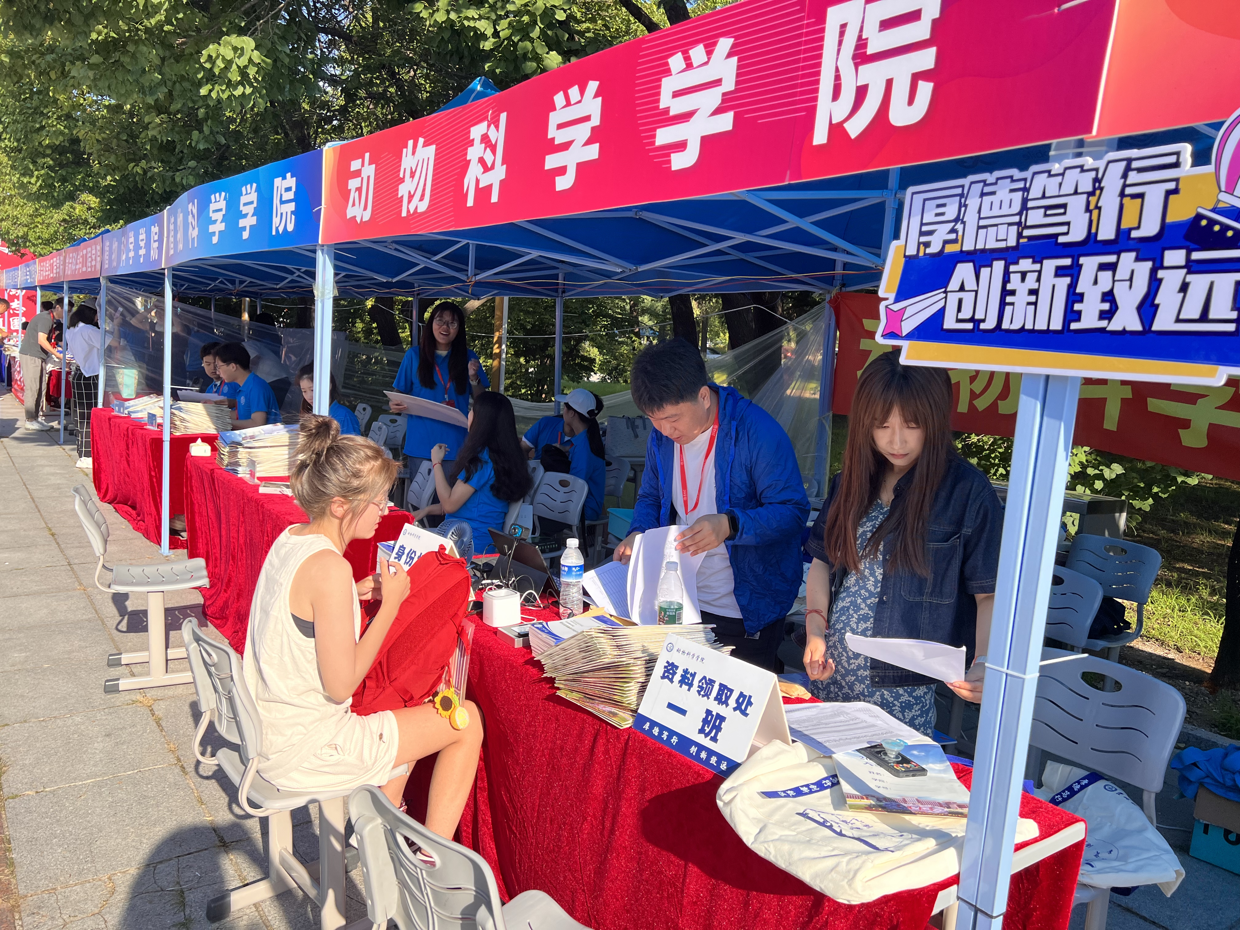 学院报到处悬挂着属于动科的欢迎条幅,志愿者们顶着大太阳将新生由校门口引导至报到处,现场注册、身份确认、领取资料袋……新生们在各班班代的指导下,顺利完成相关手续的办理。高效、便捷、贴心的报到,让刚刚离乡的新生们感受到“家”的温暖。