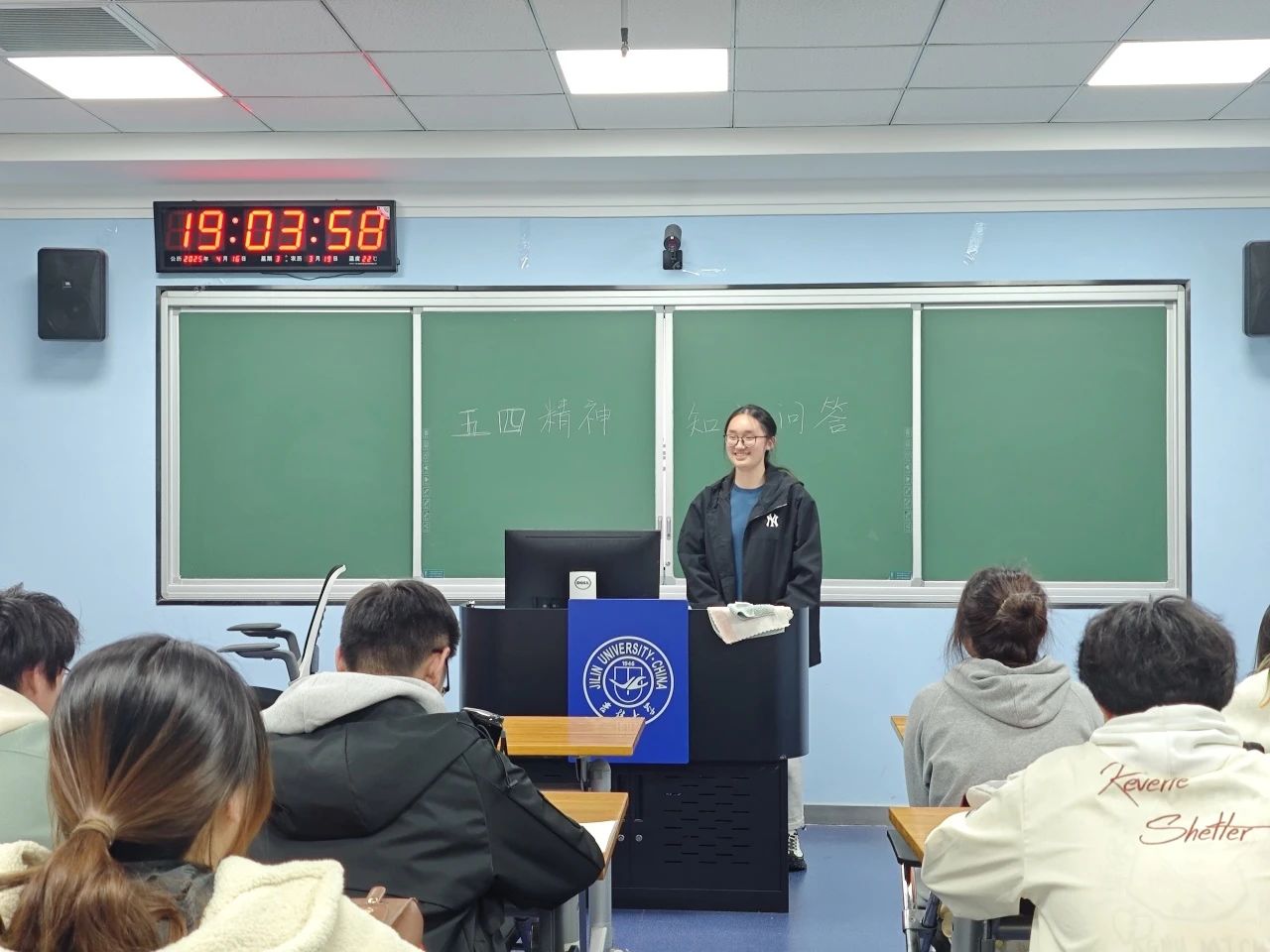 4月16日,2024级2班于前卫南区逸夫教学楼206举办了“传承五四薪火,担当时代使命”主题团日活动。团支书为同学们阐述学习五四精神的重要性。紧接着,全体同学共同观看了经典电影《无问西东》,观影结束后,大家展开了热烈的讨论,分享自己对影片中所体现五四精神的理解,从对自我价值的追寻到对家国责任的担当,拓宽了对五四精神的认知维度。同学们对弘扬践行五四精神有了更深刻的认知和体会。随后,在五四精神知识问答竞赛环节中,同学们沉稳应对,展现出扎实的知识储备,现场气氛热烈。五四精神的种子,正逐渐生根发芽。