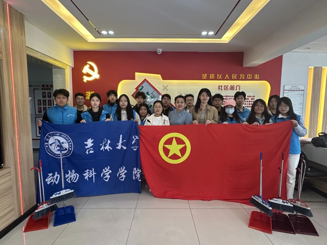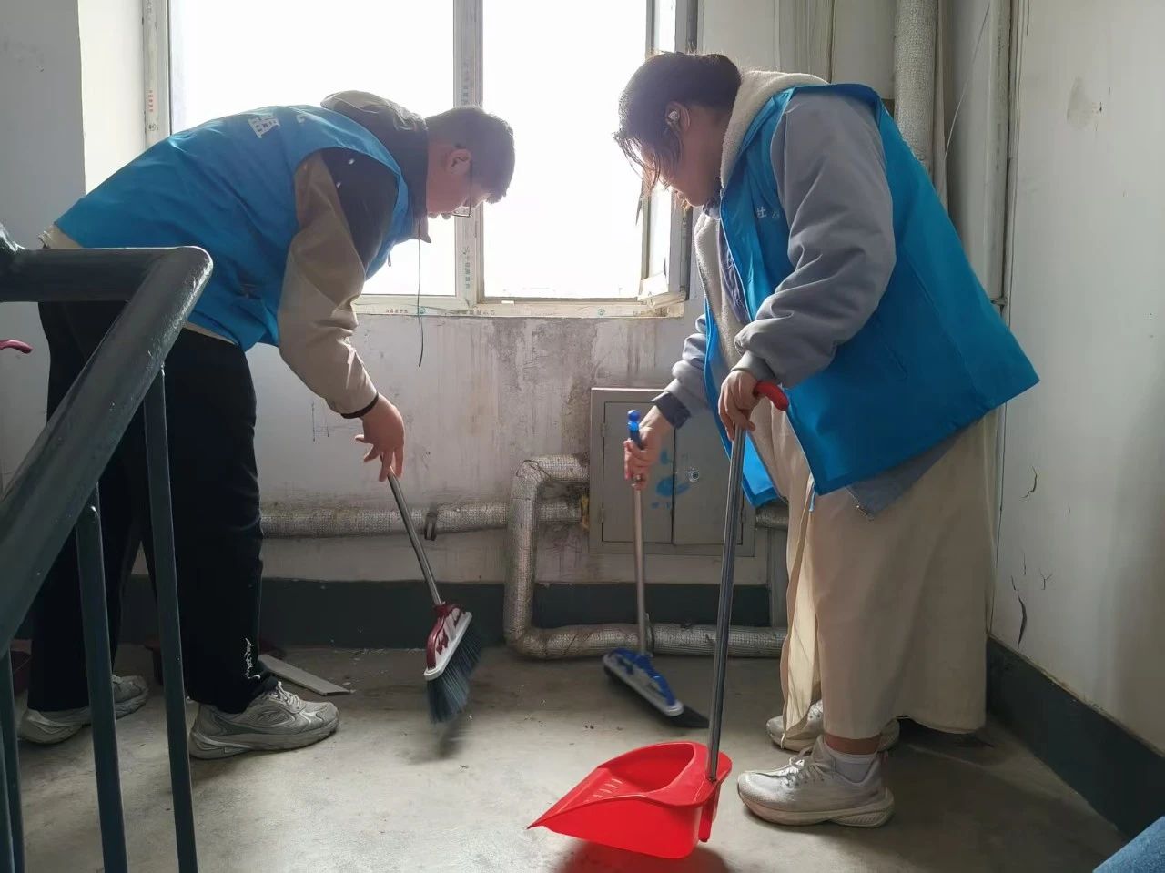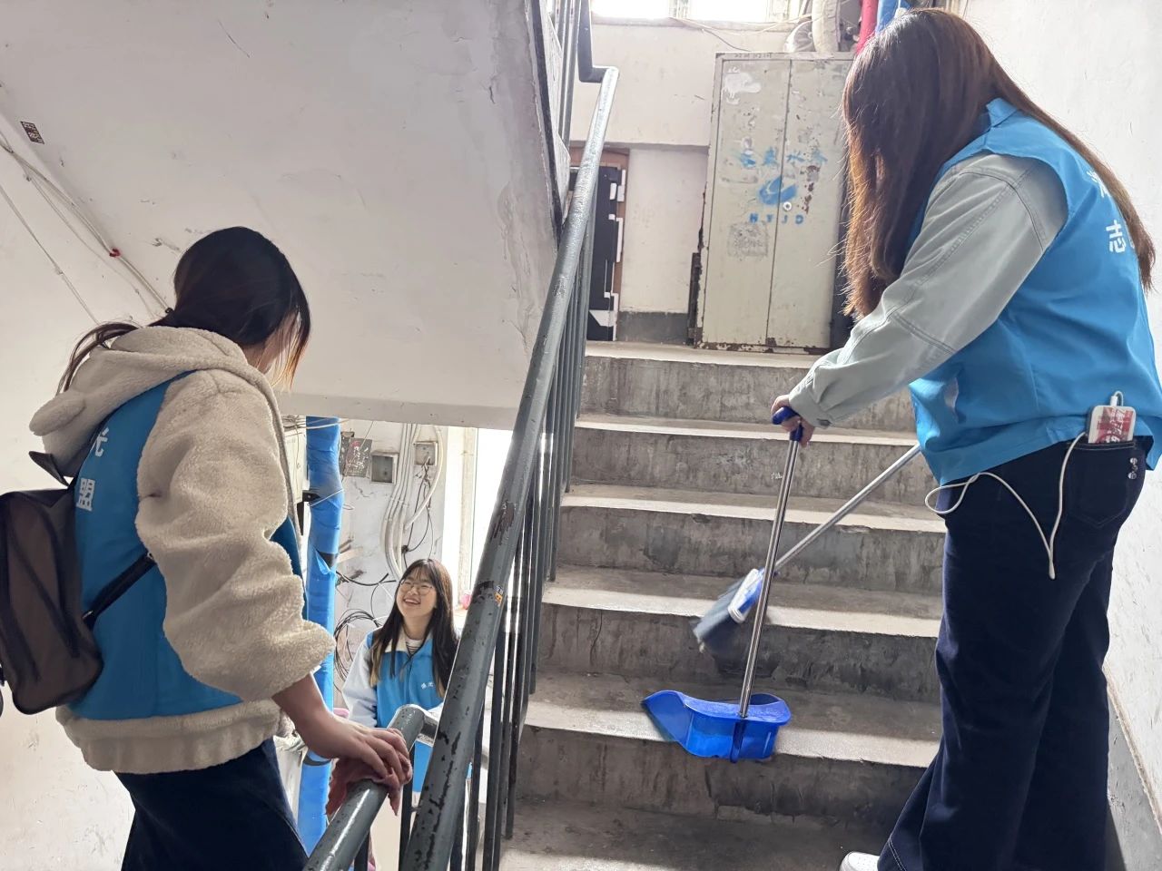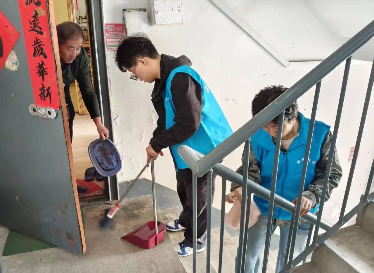 在社区工作人员引导下,同学们迅速分组领工具,有序开展清扫。大家干劲十足,认真清扫楼道台阶,用扫帚清除灰尘杂物;对扶手先湿擦后干抹,使其焕然一新。即便面临灰尘大、垃圾多等困难,同学们仍相互配合、积极应对,高效完成任务,为居民打造了整洁的出行环境。
