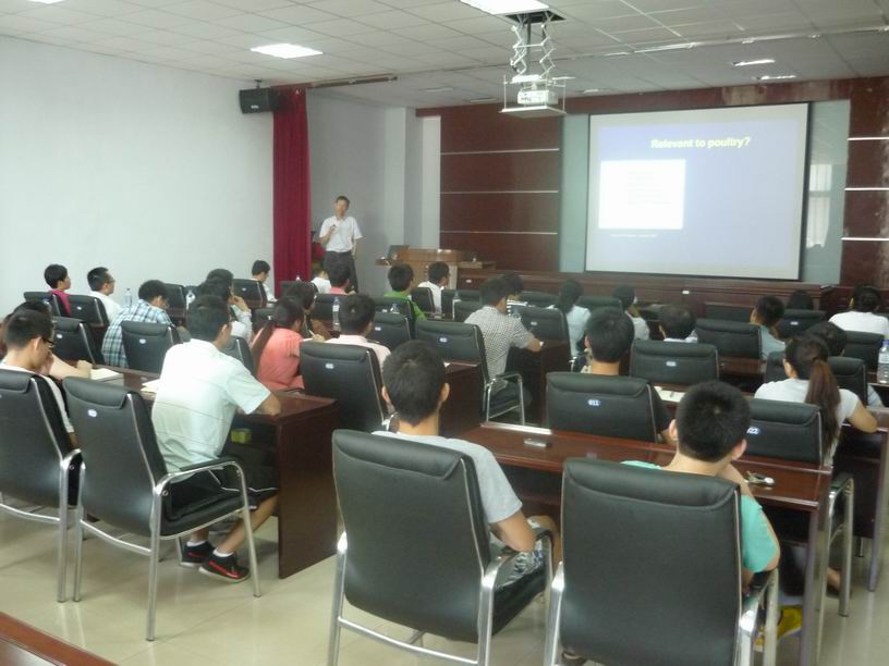 7月11日,美国加州大学戴维斯分校(UC DAVIS)动物科学系周怀军副教授在中国农业大学王军军副教授、山东农业大学李显耀副教授等的陪同下应邀到九游体育官网开展学术交流,并为学院师生做了题为“Genetic architecture of resistance to pathogens in the chicken using a systems biology approach”的学术报告。学院院长张嘉保教授、副院长欧阳红生教授以及九游体育官网、动物医学学院的有关教师、研究生近100人参加了学术报告会。