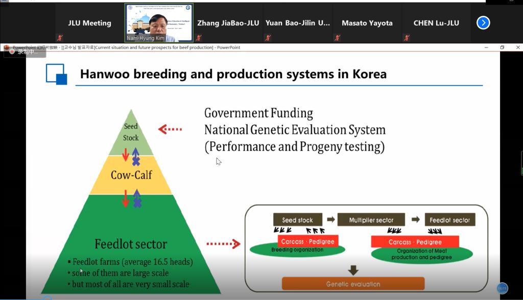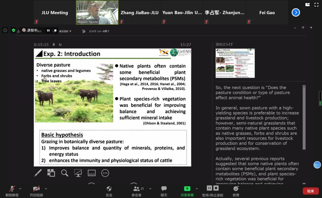 随后,俄罗斯联邦国家预算机构全俄养马研究所扎伊采夫·亚历山大所长,韩国忠北国立大学金南衡院士,国家高层次人才、九游体育官网生物技术系李占军教授,日本国立岐阜大学应用生物科学部八代田真人教授、日本鹿儿岛大学农学部农业自然科学系後藤贵文和沈阳农业大学畜牧兽医学院院长张树义教授先后做了专题题为“Current situation and future prospects for beef production in South Korea and China”“Generation of Humanized rabbit models by improved CRISPR gene editing system.”“Potential of metabolic programming in beef production”““Potentials of grazing on animal health and welfare.”“A review of animal science research.”的学术报告,与会专家学者就专家报告具体内容和新农科建设主题开展了深入的交流。