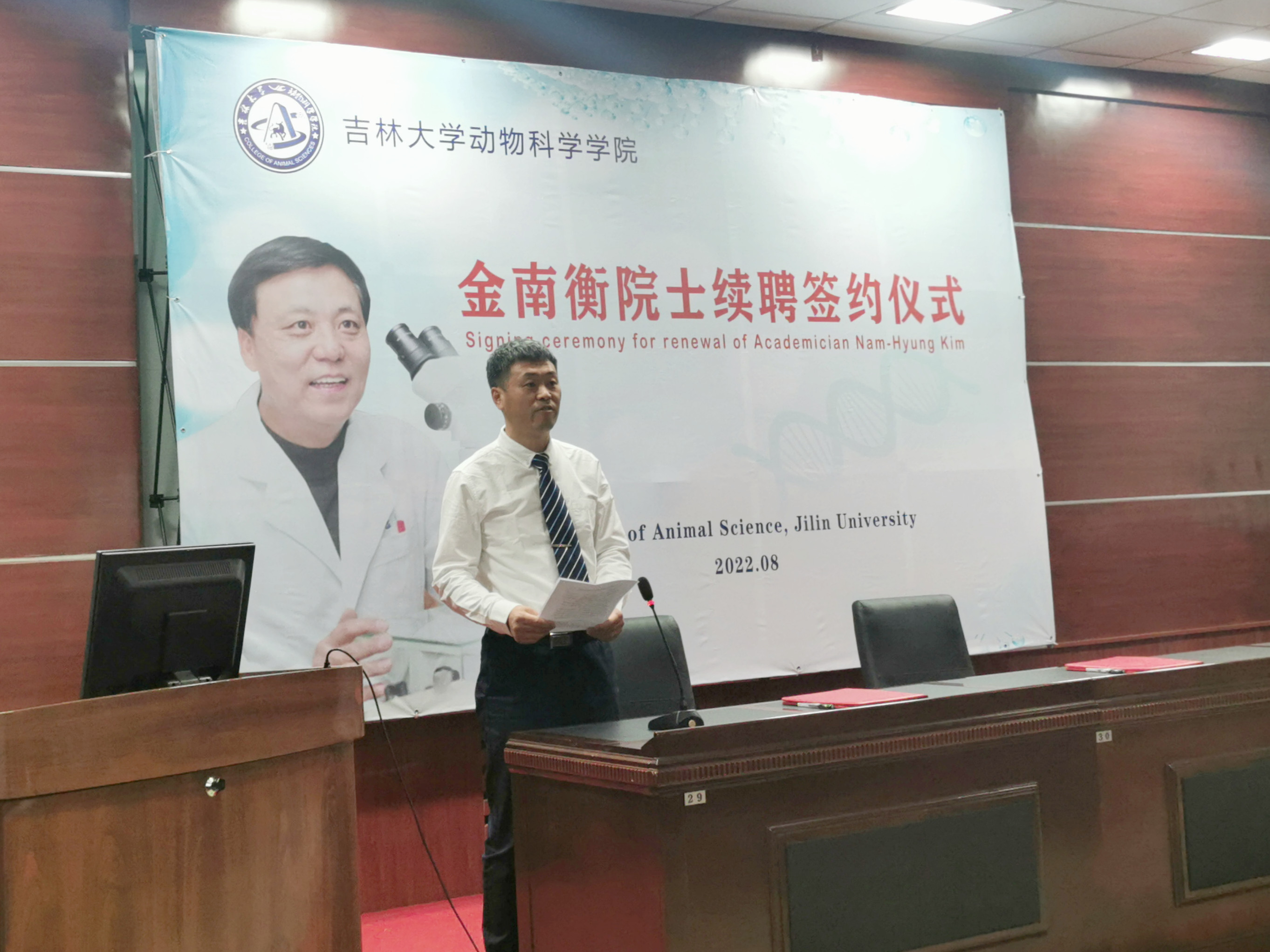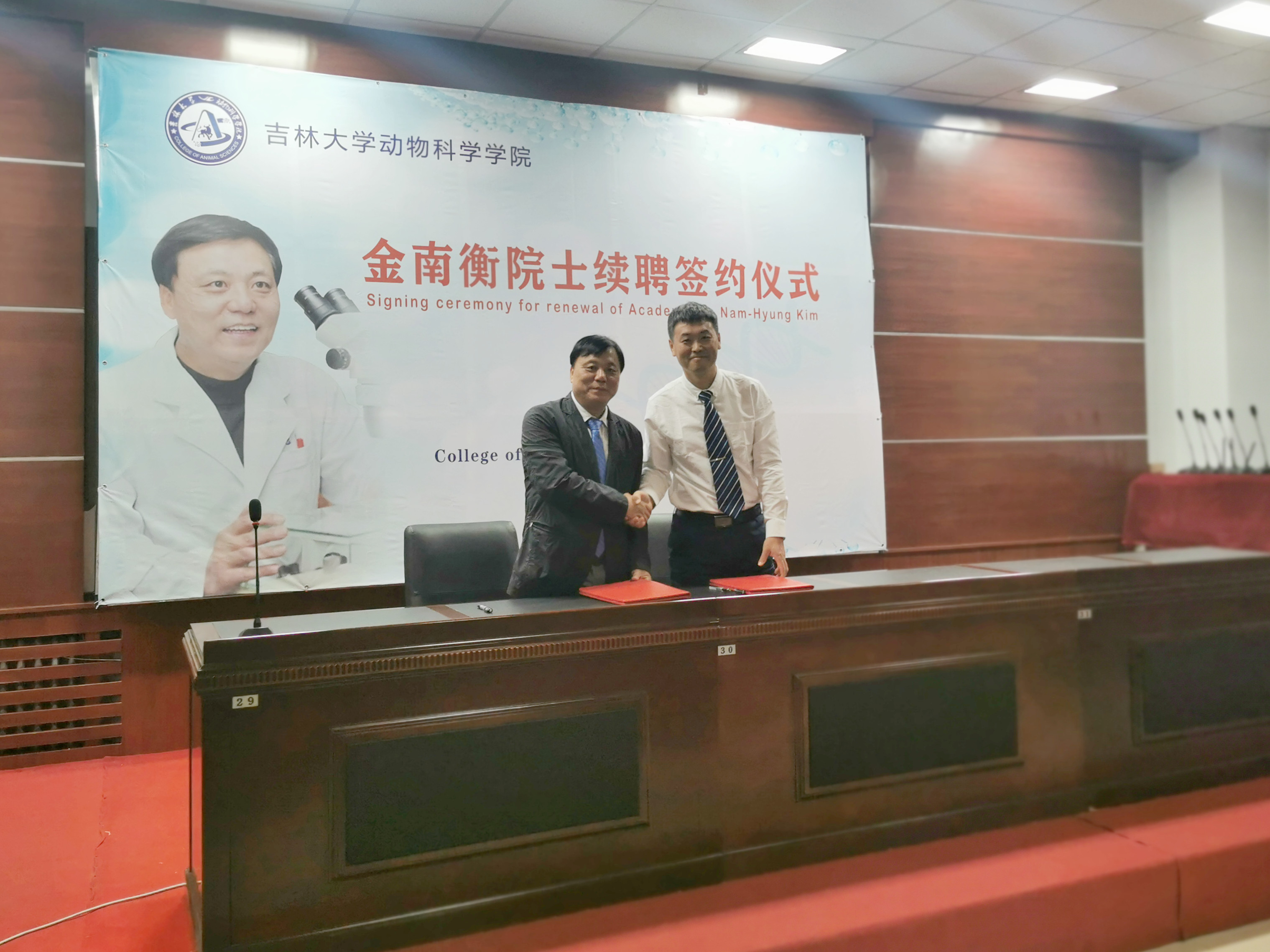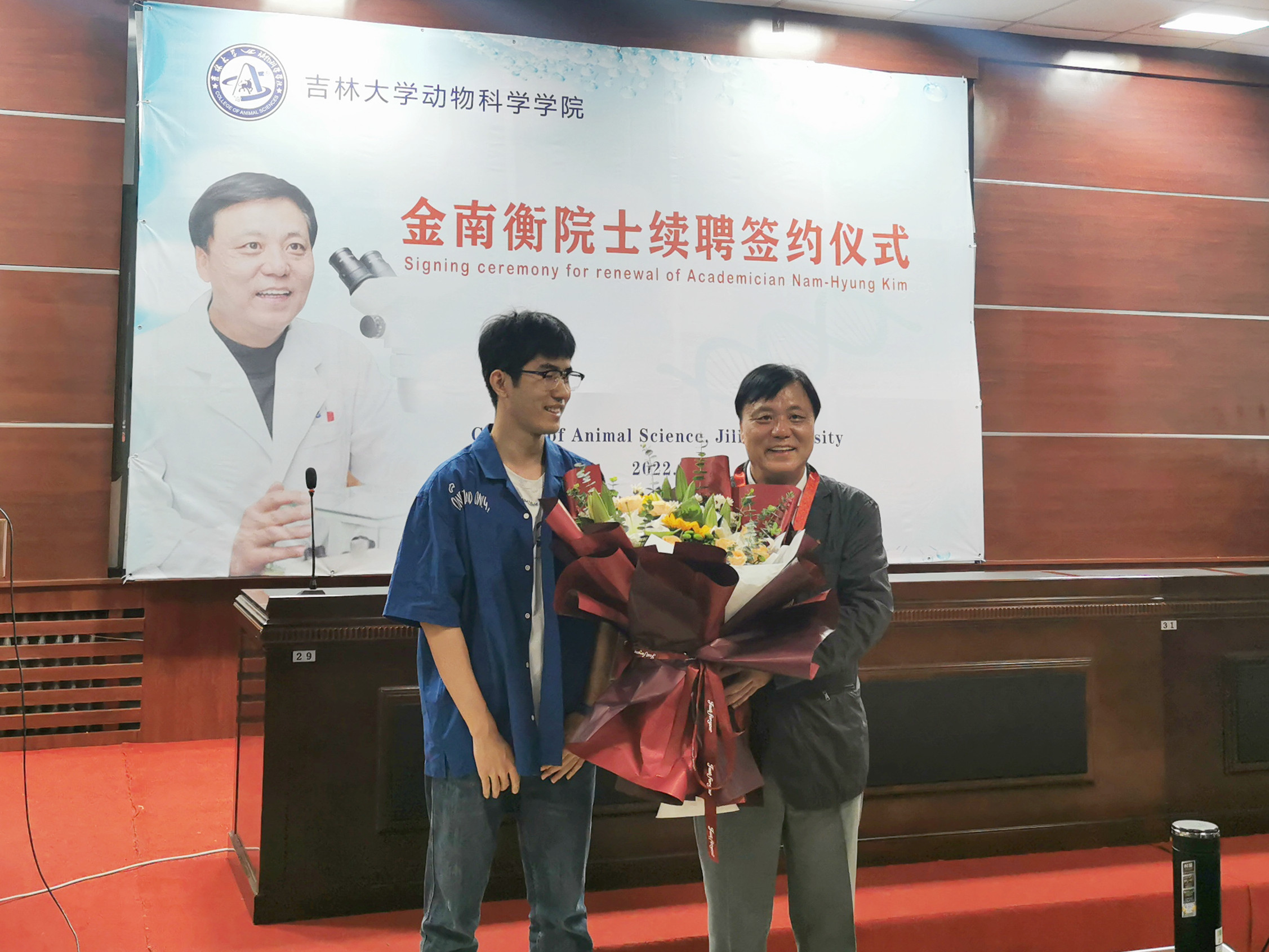 随后,孙博兴院长与金南衡院士签署了续聘协议。张嘉保教授代表中国畜牧兽医薛徽动物繁殖学分会向金南衡院士授予名誉会员证书和奖章,学生代表向金南衡院士献花。