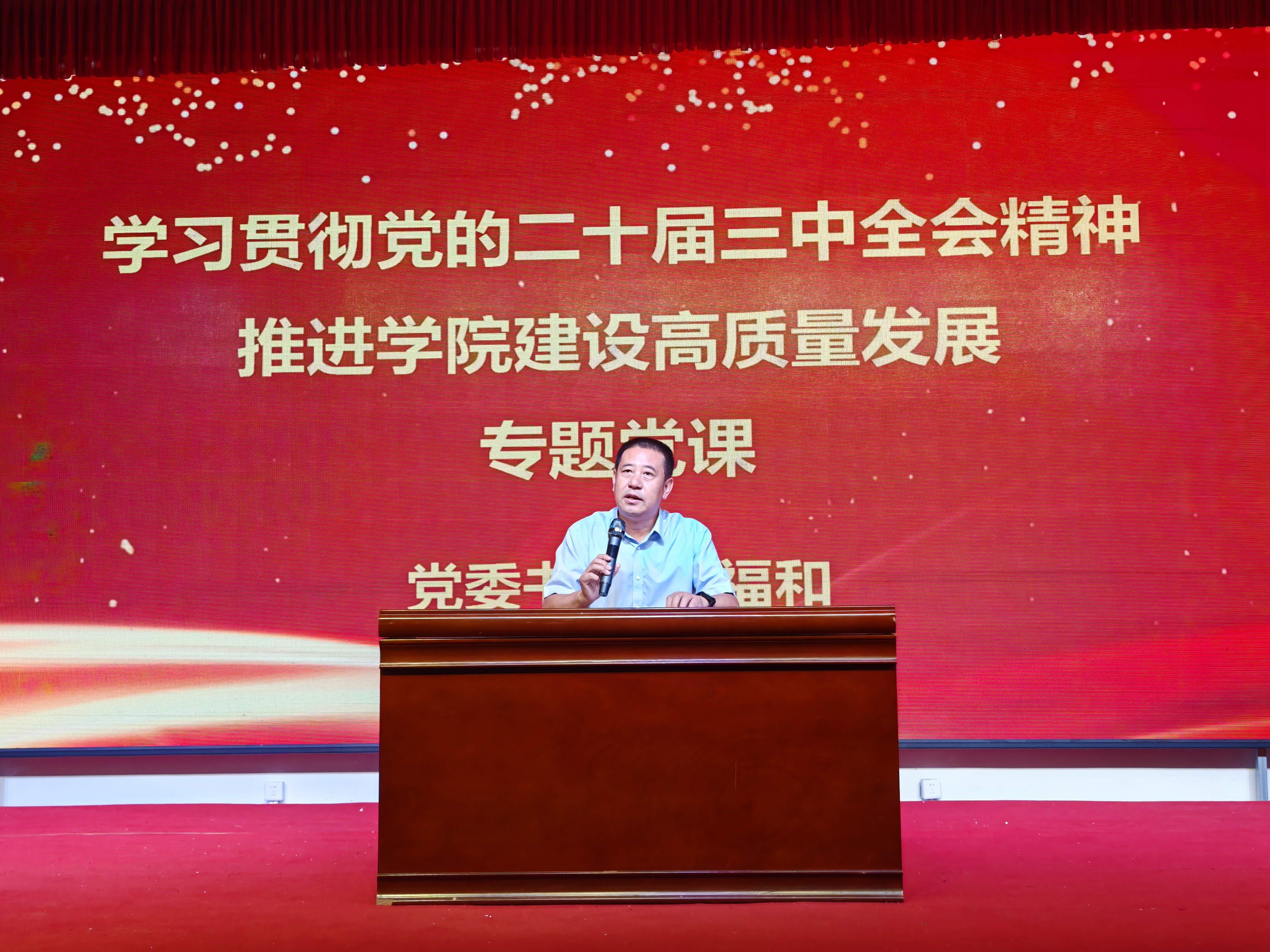 最后,党委书记高福和同志为全体人员讲授“学习贯彻党的二十届三中全会精神,推进学院建设高质量发展”专题党课。高书记从党的二十届三中全会的指导思想、全面深化改革的总目标,十四个方面的改革任务等方面深入阐释了党的二十届三中全会的历史背景、重大意义和科学内涵,并结合学院实际,提出学院将努力在学科专业建设、人才队伍建设、教育教学、平台建设、科学研究和成果转化、人心凝聚和服务保障等七个方面久久为功,助力学院建设高质量发展。高书记鼓励全体教职工继承和弘扬畜牧学、生物学等老一辈教育家、科学家精神,深耕教育事业,承担强农兴农使命,持续为建设教育强国、农业强国贡献动科力量。