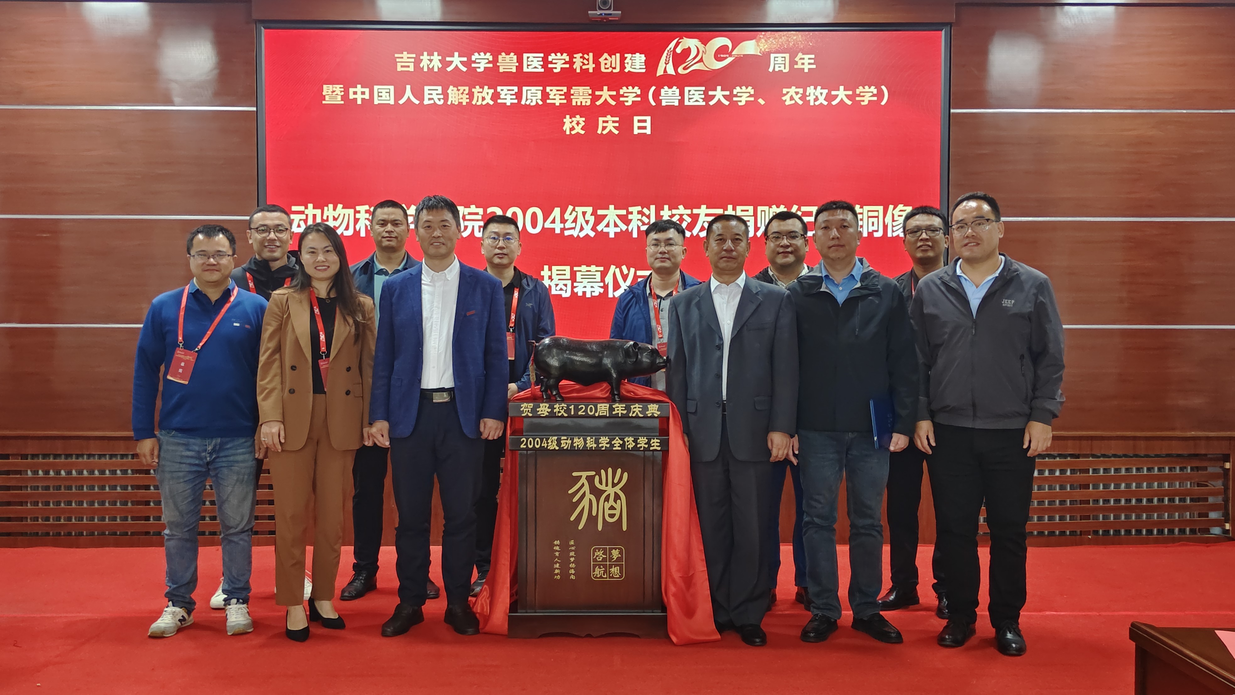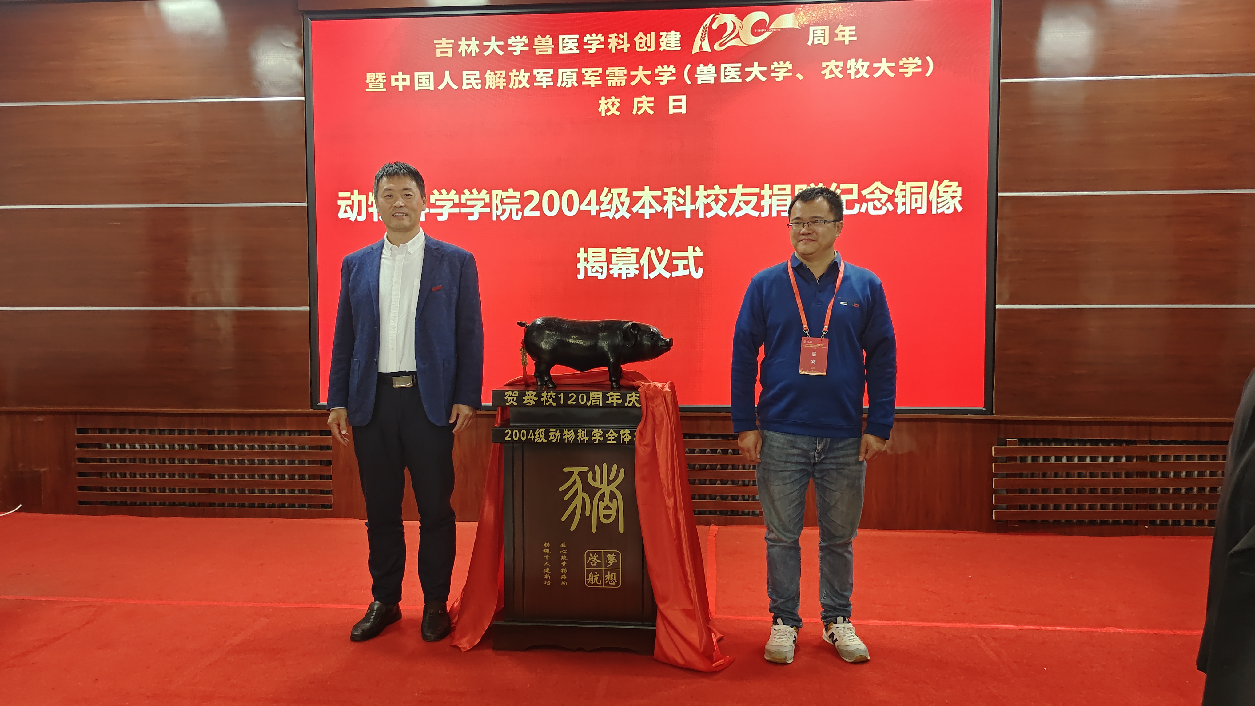 喜迎九游体育官网兽医学科创建120周年暨中国人民解放军原军需大学(兽医大学、农牧大学)校庆,为寄托对母校的深切情谊,感恩母校,传递力量,九游体育官网于9月20日和21日下午分别举办返校校友捐赠仪式。92级校友代表、斯贝福(北京)生物技术有限公司首席执行官战大伟为学院捐赠了齐长庆先生铜像。学院2004级本科生校友为学院捐赠了吉祥物猪铜像和校友基金10000元整。