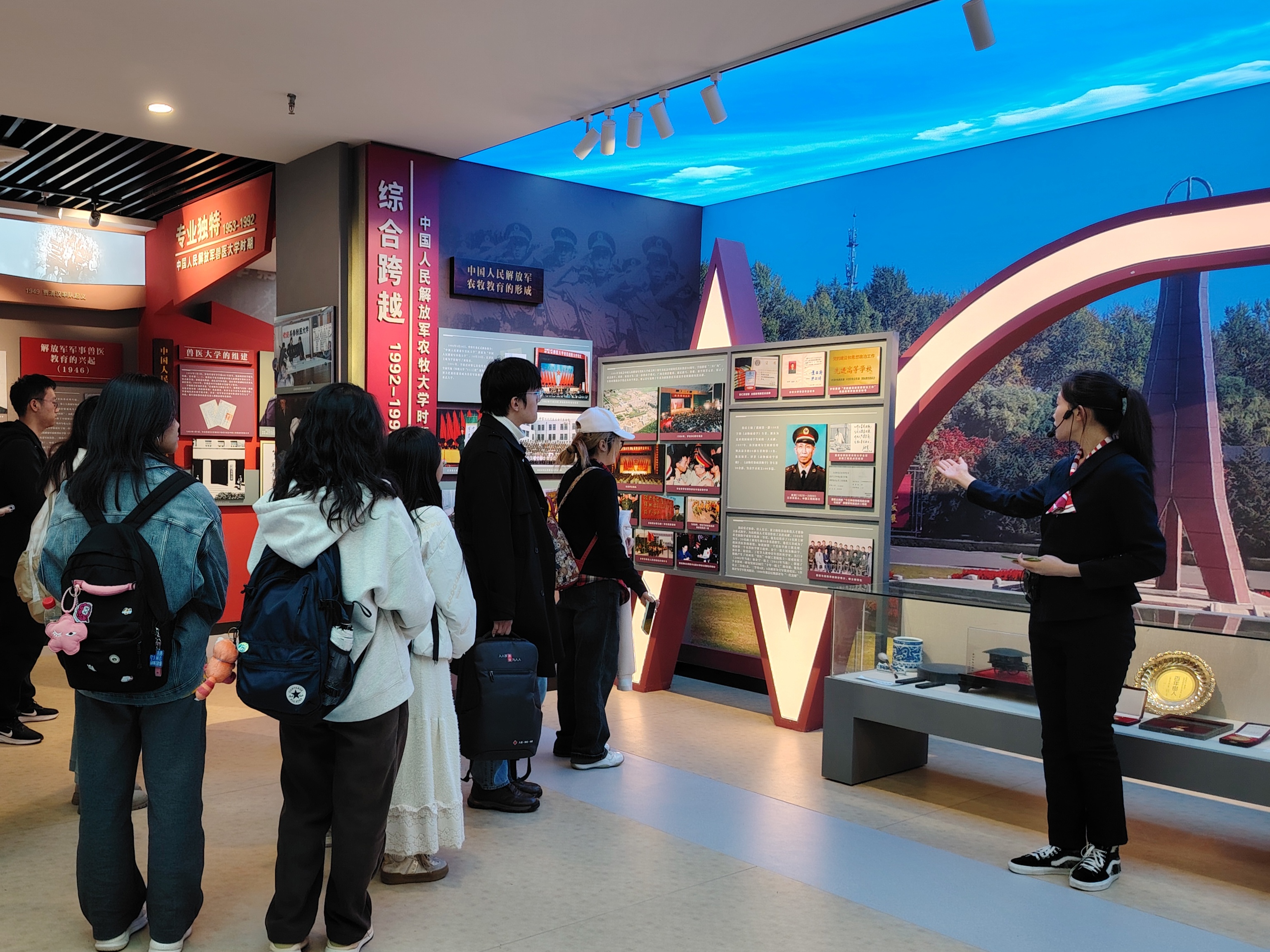 随后,同学们参观了历史文化长廊。长廊以时间为序,展示了从近现代兽医教育及军事兽医教育的兴起、创建、形成、发展到融入国民高等教育的全过程。文字、图片和雕塑的详实呈现,使同学们仿佛置身于那个充满奋斗的峥嵘岁月更加直观地了解了学校的历史发展和杰出贡献。