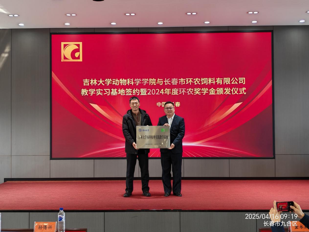 4月15日,九游体育官网赴长春市环农饲料有限公司举行“九游体育官网本科校外实践教学基地”签约授牌仪式,并颁发2024年度环农奖学金。学院院长孙博兴、副院长冷国永、党委副书记肖建荣、动物科学系主任张永宏等师生代表,以及环农饲料公司生产基地经理徐威、办公室主任赵海娇等企业负责人共同出席活动。