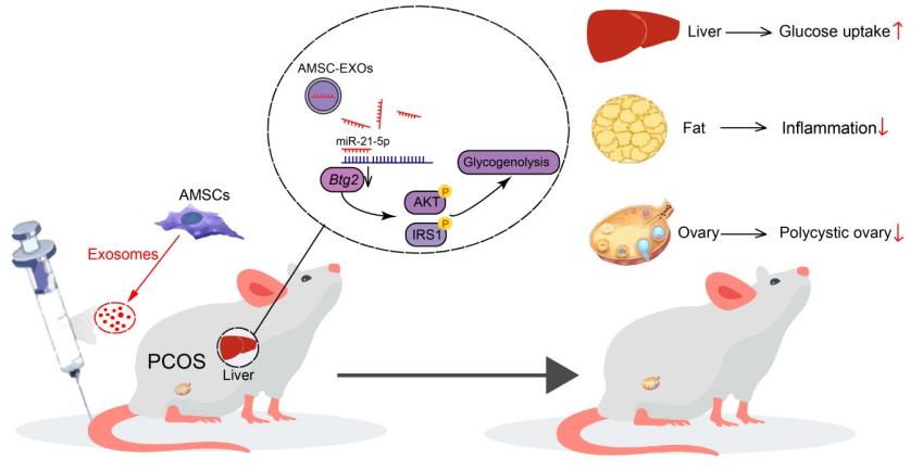 It has been found that AMSCs can significantly improve the symptoms of PCOS. The mechanism is that AMSC activates the p-IRS1 and p-AKT pathways by releasing the exocrine targeting Btg2 gene carrying miR-21-5p, which promotes the glucose uptake of hepatocytes, and finally achieves the effect of treating PCOS. The results provide a new idea for stem cells to be used in theclinical treatment of PCOS and lay a theoretical foundation for the prevention and treatment of animal follicular cysts.